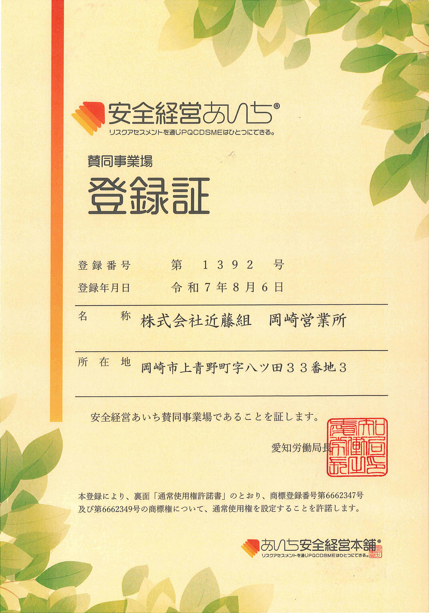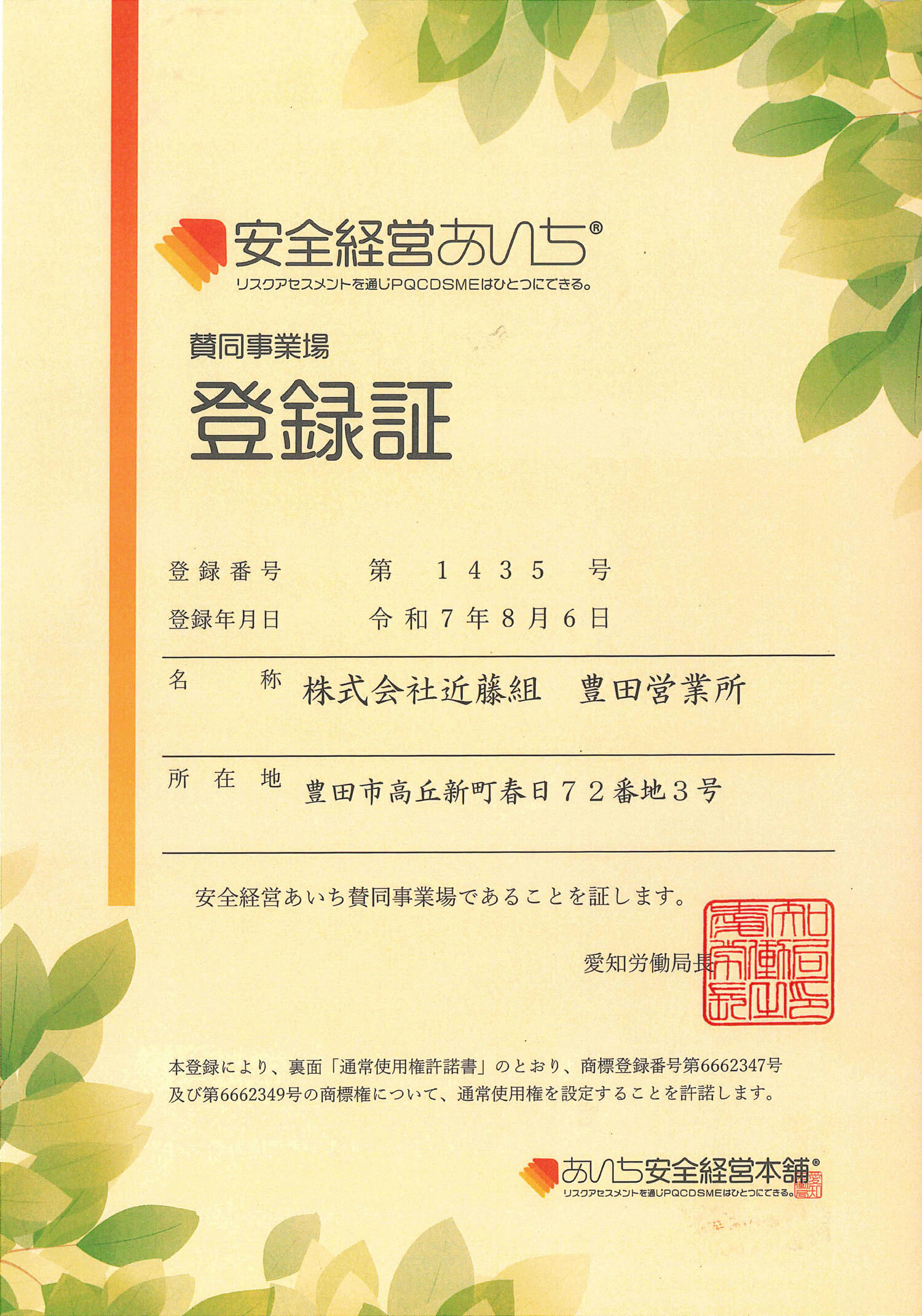 この度、愛知労働局が提唱する「安全経営あいち」の賛同事業所場として近藤組豊田営業所・岡崎営業所が登録されました。