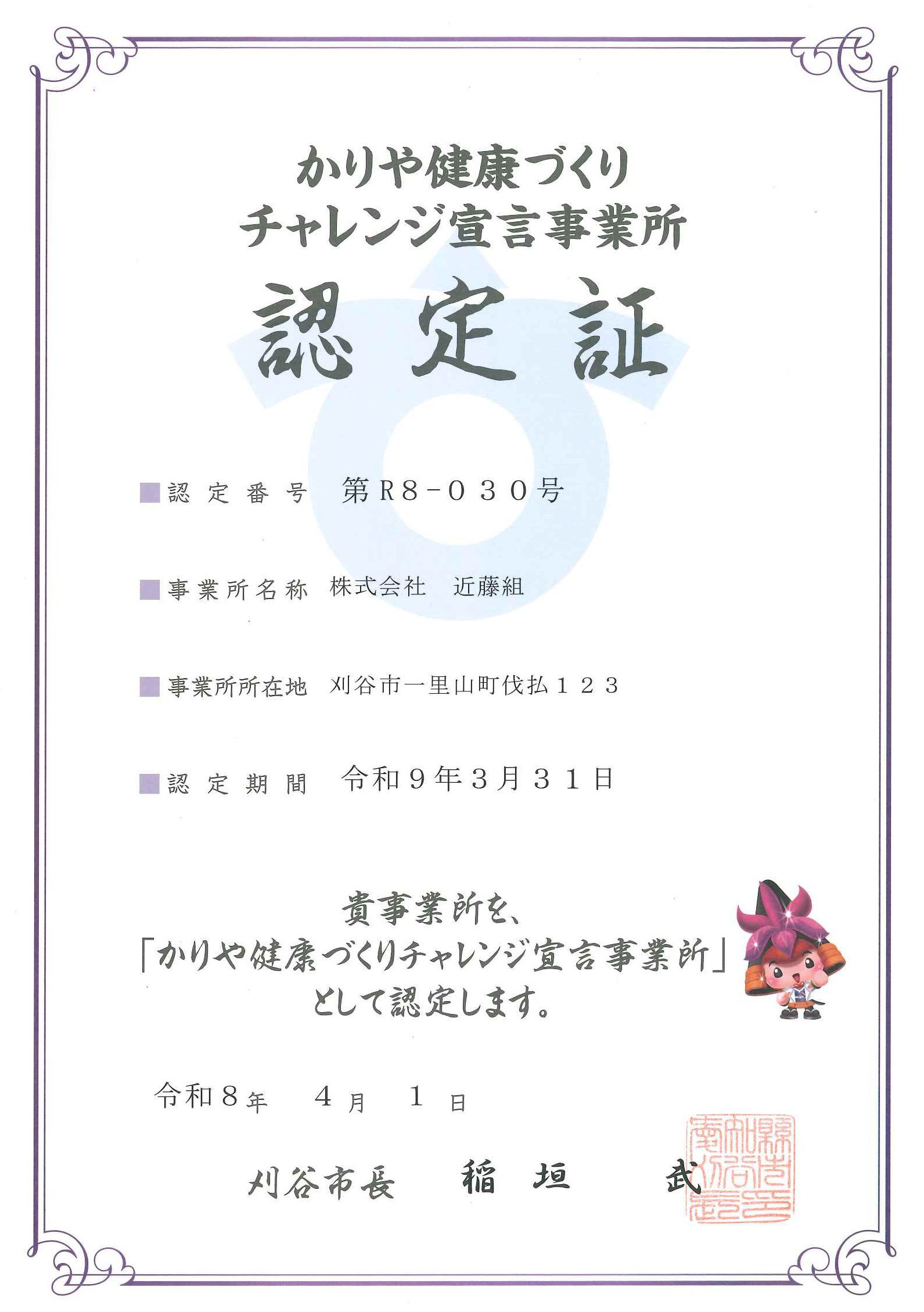 刈谷市役所では、健康づくりに取り組む事業所に対して、かりや健康づくり チャレンジ宣言事業所としての認定を行っており、2018年12月5日より健康づくりチャレンジ事業所として認定され、今回認定が更新されました。